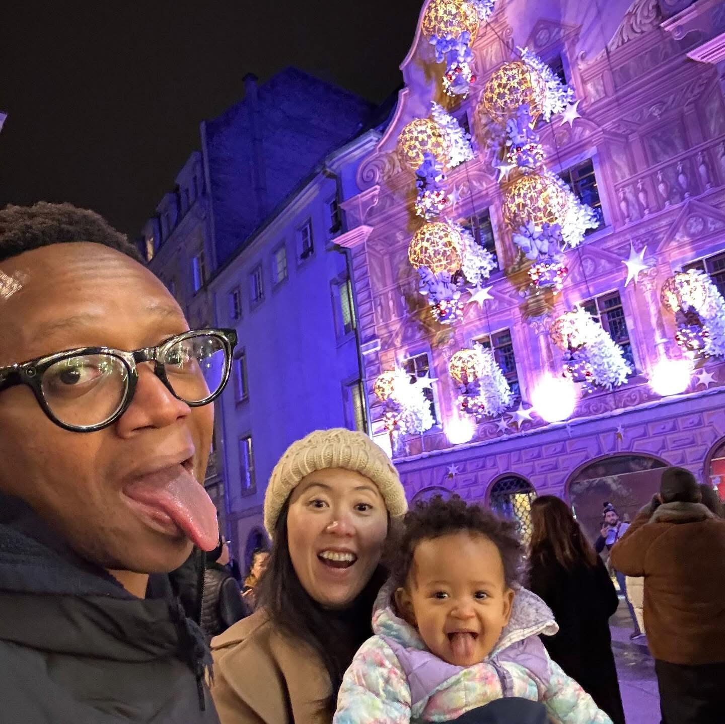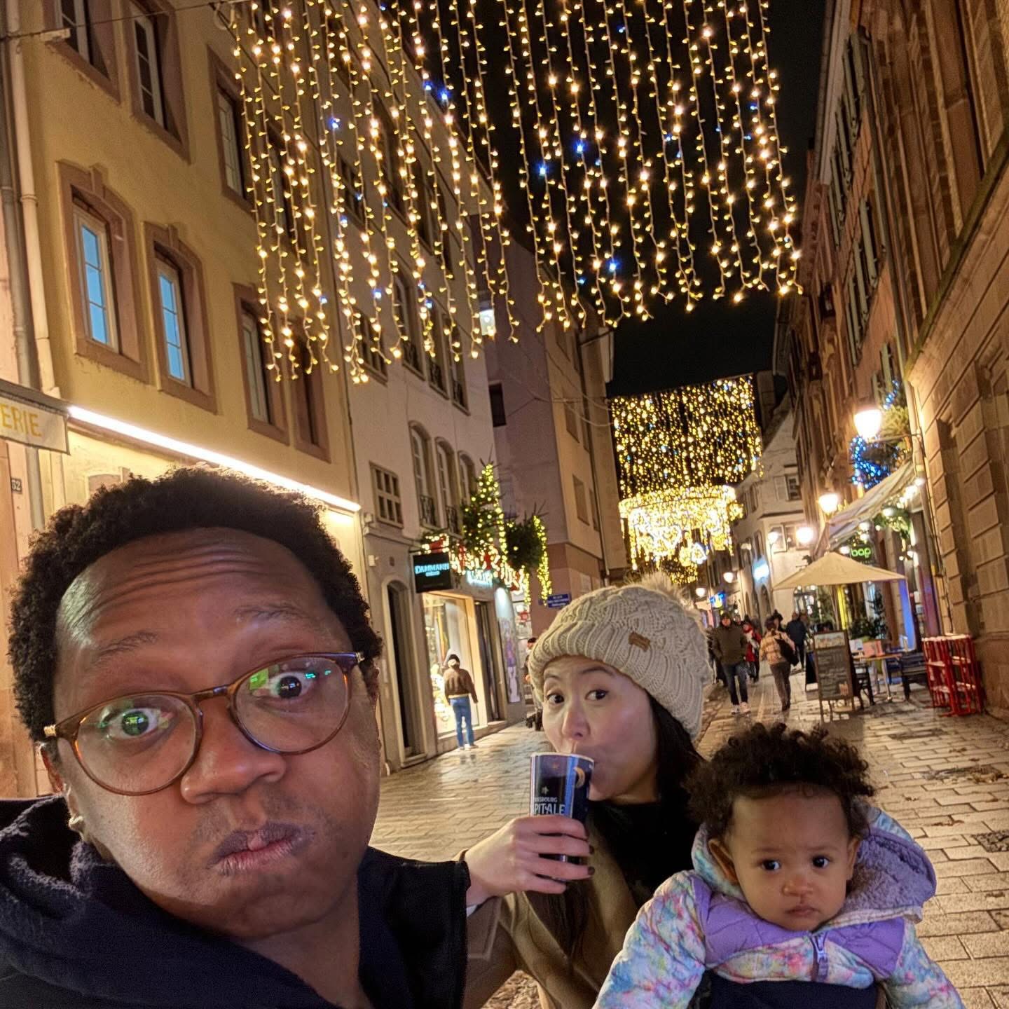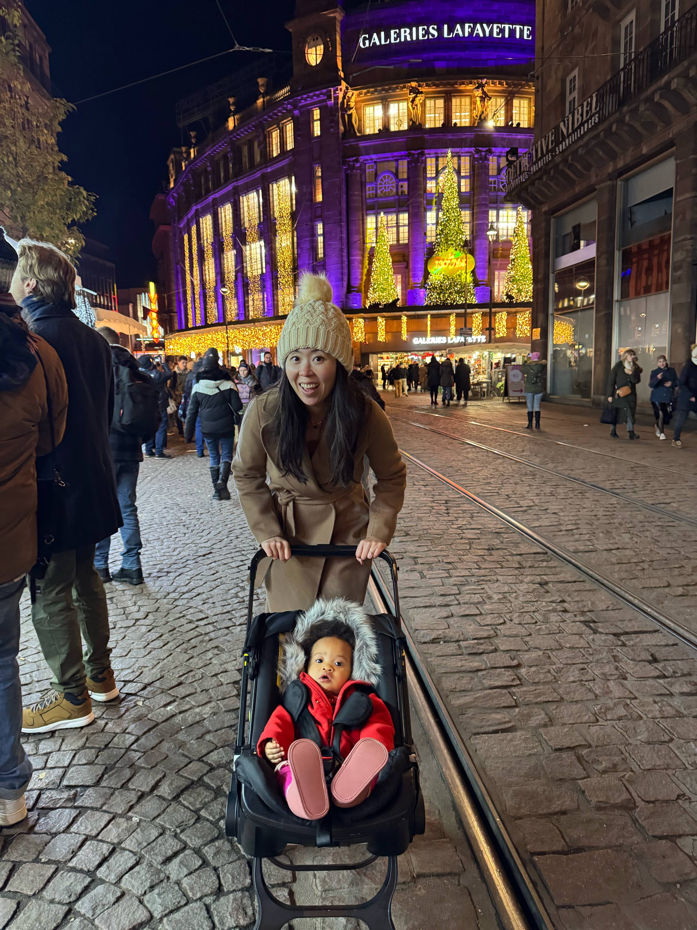 The city radiated festive spirit. We wandered cobbled streets with glühwein in hand, surrounded by twinkling lights, carousel music, and the scent of roasting chestnuts. Karimi was mesmerized by the sparkling ornaments, and hopefully picked up the tune to “Petit Papa Noël” somewhere along the way.